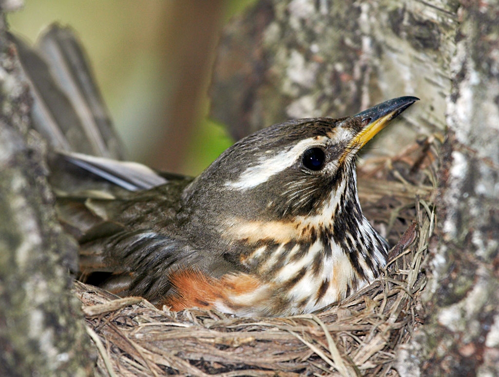 Дрозд белобровик на гнезде