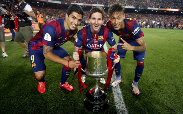 Луис Суарес, Лионель Месси и Неймар с кубком Испании |