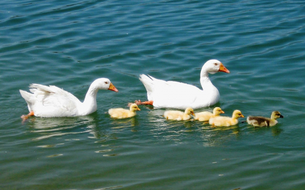 Картинки » Животные » Птицы » Гуси » Пара белых гусей с выводком