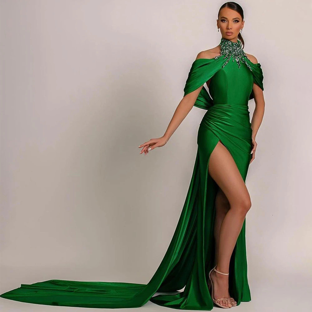 Атласное зеленое вечернее платье