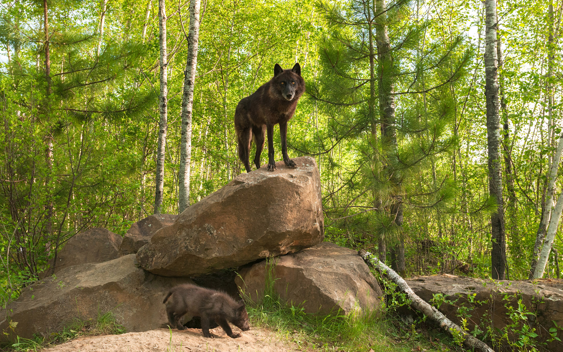 Картинки » Животные » Волки » Волчица и волчонок в лесу